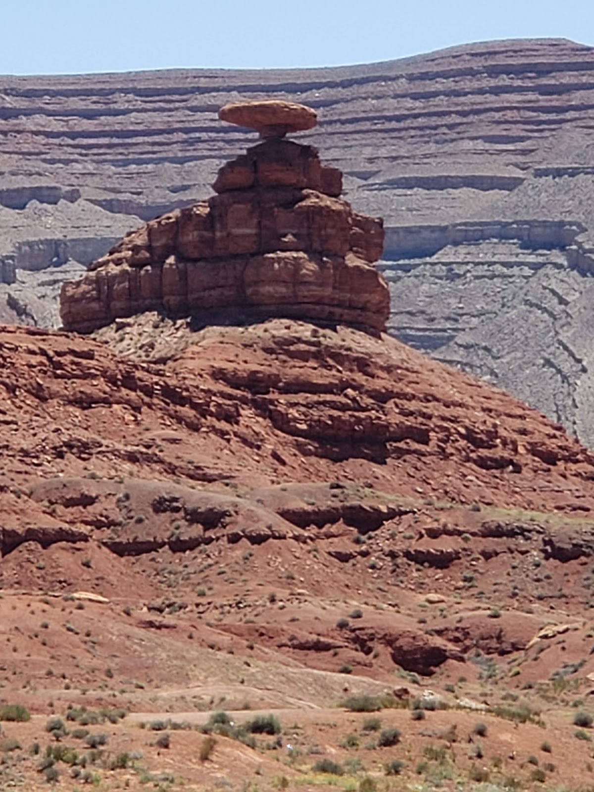 From there we went and saw the Mexican Hat stone. What a balancing act! We stopped in the little town of Mexican Hat and got gas and ice and took the necessary pit stop. Met a real nice couple from Vernon, BC Canada, who were shocked that a couple of wild gals from Oklahoma would know where Vernon was! We bid them safe travels since they were on a motorcycle trike towing a small trailer up the west coast. Their next destination was the South Rim of the Grand Canyon.